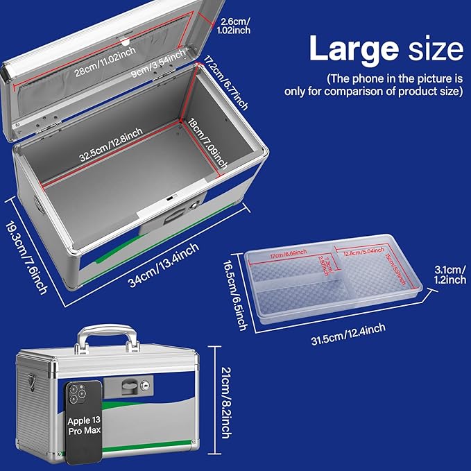 - STURDY AND DURABLE: Made of high-quality aluminum alloy and MDF, detachable plastic tray, our lockable drugs storage box is constructed with 4 steel corners, aluminum reinforcement, and an extra strong key lock to ensure your materials are safe