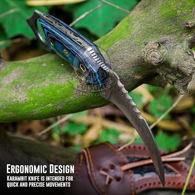 - Exquisite Damascus Steel: Our Curved knife features a stunning blade crafted from high-quality Damascus steel, known for its distinctive wavy patterns and superior strength. This blade is not only visually striking but also exceptionally durable.