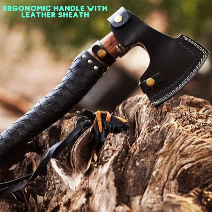 - 🌱 [SPECS AND MATERIAL]: Survival hatchet is made of high quality 1095 carbon steel semi-sharp blade width of 5'' inches, length of 4'' inches, and Rosewood Handle of 19'' with perfect hold and stable axe. The Viking-style axe is designed beautifully for both exhibit and functionality.