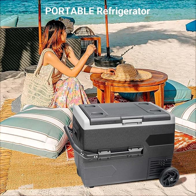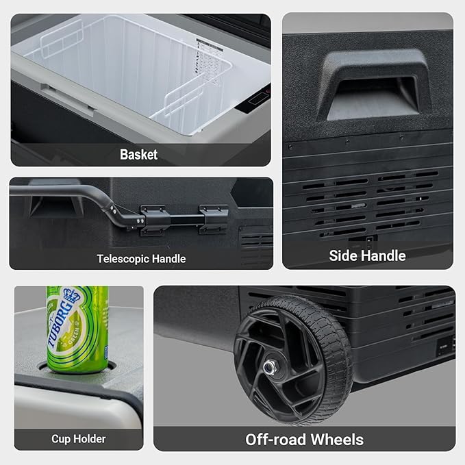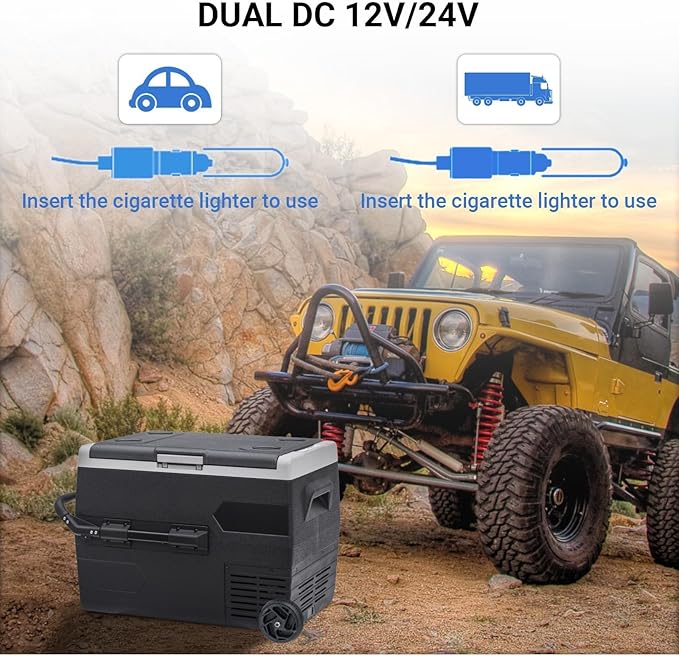 - Dual DC 12V/24V Compatible Electric Cooler: Ideal for cars and trucks use. Features off-road wheels, telescopic handle, carry grips, cup holders. Shock-proof design ensures smooth operation, perfect for rugged terrains and off-road adventures