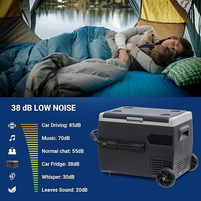- Silent Portable Fridge-Only 38dB: With a running sound of only 38 dB, the 12v refrigerator can be placed for use in any anywhere setting without disturbing your enjoyable trip and rest. The running sound is so low that you don't notice it