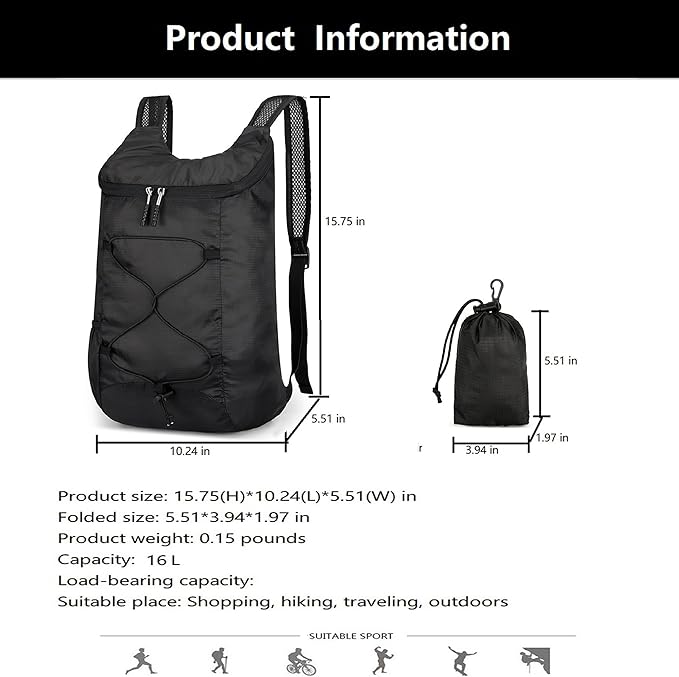 - LIGHTWEIGHT &16 L CAPACITY:The lightweight hiking daypack weighs only 2.82 ounces.unfold size:10.23 (L)*15.75(H)*5.51(W) inches,after folding size:3.94 (L)*5.51(H)*1.97(W) inches,the bag folds to the size of a sandwich and fits in a pocket;The main pocket to carry what you need,side pockets for water bottles or umbrella