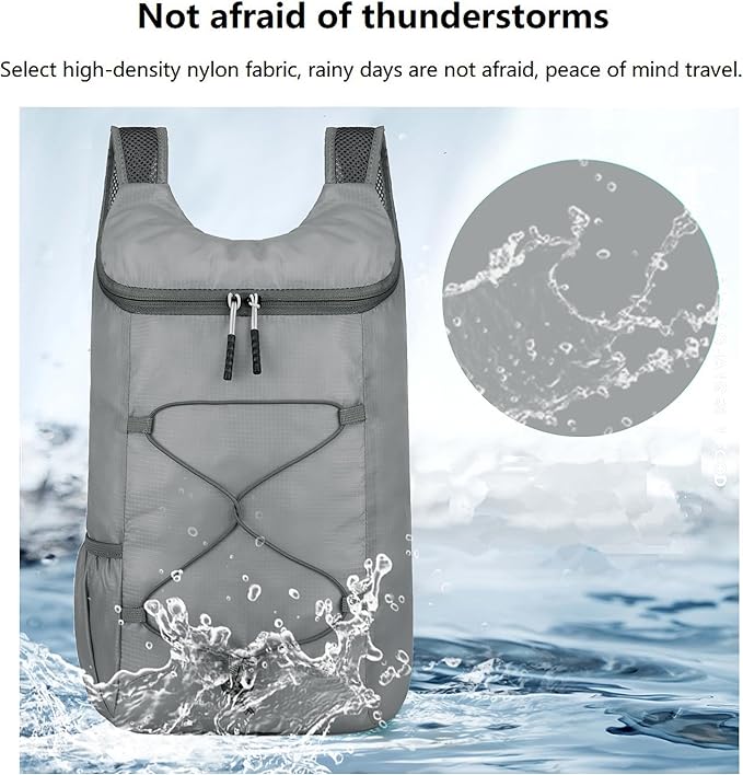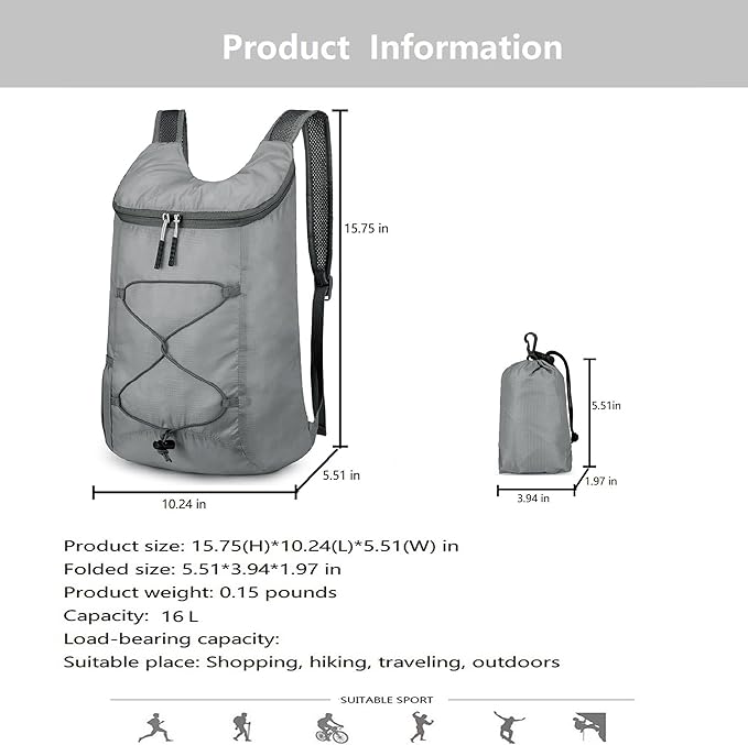 - LIGHTWEIGHT &16 L CAPACITY:The lightweight hiking daypack weighs only 2.82 ounces.unfold size:10.23 (L)*15.75(H)*5.51(W) inches,after folding size:3.94 (L)*5.51(H)*1.97(W) inches,the bag folds to the size of a sandwich and fits in a pocket;The main pocket to carry what you need,side pockets for water bottles or umbrella
