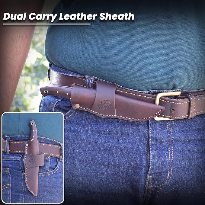 - Safe Horizontaly / Vertical Carrying: The cowboy style dual carrying (vertical / horizontal) sheath is made from high quality vegetable tanned leather. Due to horizontal carrying the knife in the sheath stays along the belt and does feel during movement. The Sheath is Snug Fit!