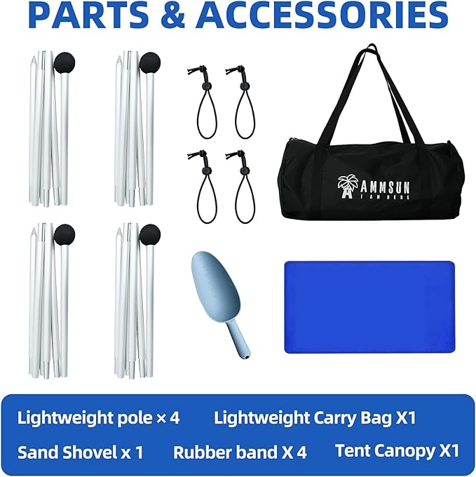 - 【Quick & Easy Setup】– AMMSUN beach tent can be set up by a single person in less than five minutes. First fill the sandbags, assemble and upright the poles, Tie the bungee cord to the EVA foam ball , you will get a spacious sunshade beach tent. As the sun moves throughout the day, simply move your sandbag anchors to a different spot, or adjust the position of the poles, to get the best shelter from the sun and keep enjoying the outdoors