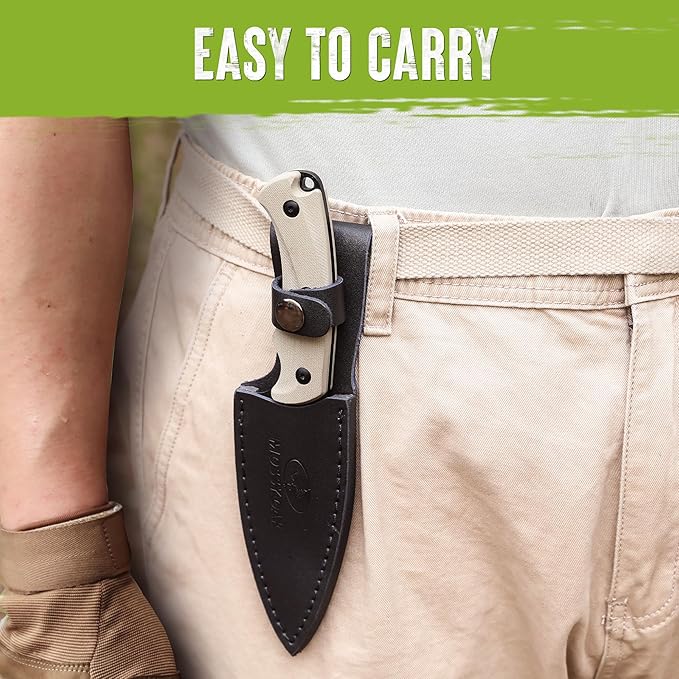 - Knife with Leather Sheath: A high-quality leather sheath helps keep the blade sharp for a longer time and includes a safety button and belt loop that can be connected to a belt