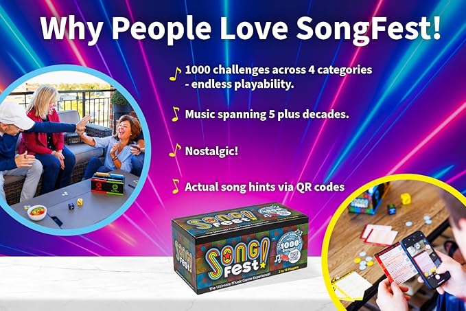 - EASY TO LEARN and fun to play for 2-12 players. SONGFEST! provides 1,000 challenge questions plus a decades die and categories die for a unique experience with family and friends keeping everyone involved.