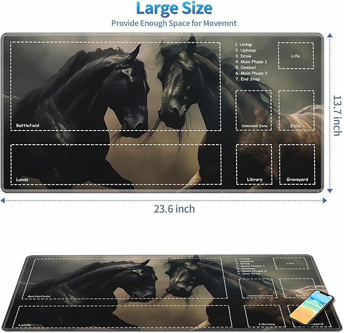 Playmat for MTG with Zones, 24 x 14 inches Game Play Mat for MTG TCG, Trading Card Game Play Mat Desk Mats with Stitched Edges Non-Slip Base, Two Horses