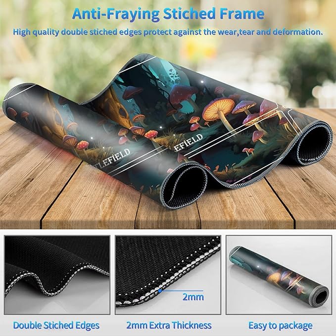 - 【Stitched Edges】MTG Playmat has delicate edges which can prevent wear. Moreover, the reinforced edges can efficiently prevent deformation and damage to guarantee long time use.Play countless matches with your heavy-duty TCG playmat.