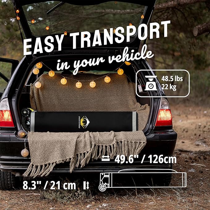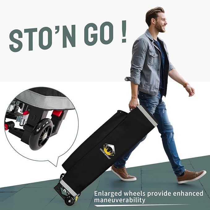 - [EASY TRANSPORT & STORAGE]: Weighing just 48.5 lbs, this canopy is designed for easy transport in your vehicle. The enlarged wheels of the Sto'N Go bag provide enhanced maneuverability, making it simple to take your canopy wherever you need shade.Comprehensive Accessories Included:8 hooks, 2 large 4" wheels, a sturdy steel frame, a cover bag, a canopy top, a repair patch, 2 hex wrenches, a nut, 4 guy ropes, 8 spikes, and 4 empty sandbags.
