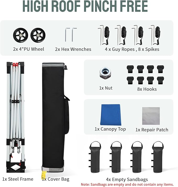 - Durable and Sturdy Frame - The canopy with sidewalls has been upgraded with a metal frame and leg tubes that are 1.2 times larger in cross-sectional area compared to other outdoor canopy, ensuring stability and durability. Equipped with 4 sandbags, it can withstand strong winds. The legs can be adjusted to 4 different heights using pinch-free buttons, and 8 hooks are included for hanging lights, signs, and more, suitable for commercial and professional events such as business activities.