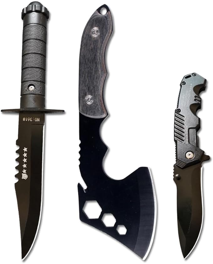 - 【Package Includes and size】:Fixed blade hunting knife * 1:11.2 " x 1.18 " + Hatchet Axe * 1:10.2 " x 3.35 " + Folding knife * 1:7.87 " x 1.18 "