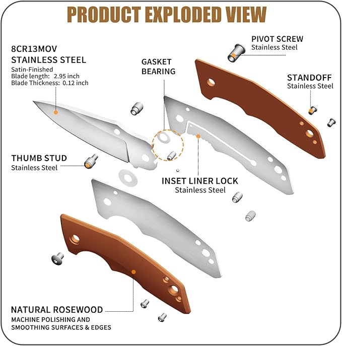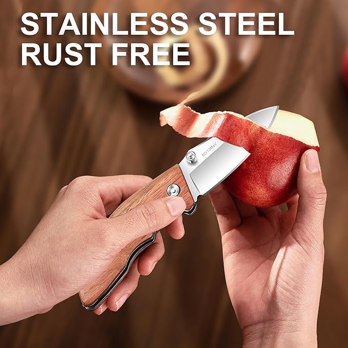 - EXQUISITE ERGONOMICS HANDLE--Made of high-quality natural rosewood which brings you comfortable and perfect anti-slip grip, and the wood handle with excellent workmanship provides exquisite look and upscale texture, so this small pocket knife is the best gift for men and women