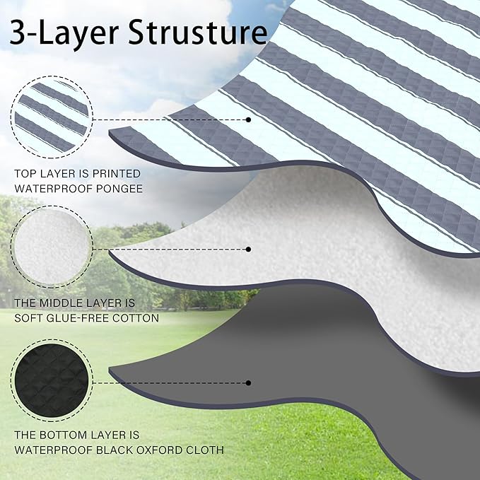 - 【Soft and Durable with 3-Layers】The picnic blanket top layer is printed waterproof pongee, the middle layer is soft glue-free cotton, and the bottom layer is waterproof black Oxford cloth. Perfectly suitable for siting or lying on grass, beach, floor or any kindly of surface, giving you soft and comfortable feelings.