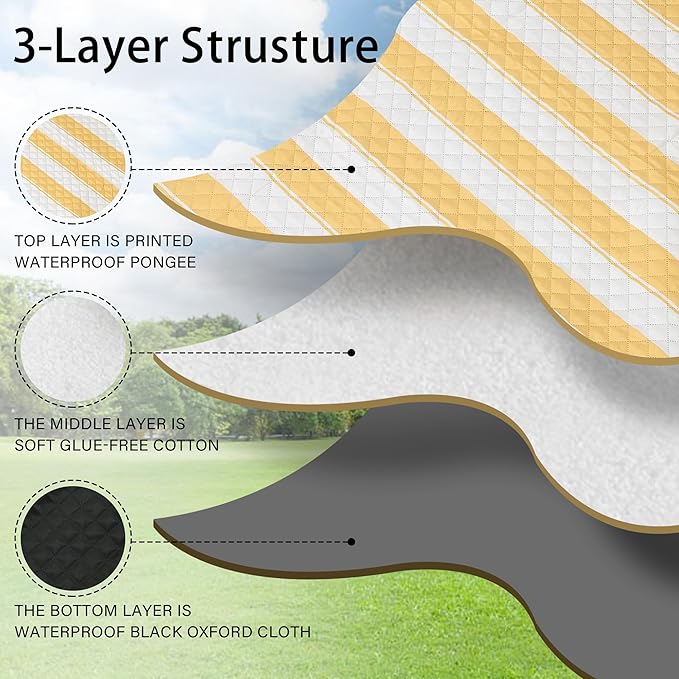 - 【Soft and Durable with 3-Layers】The picnic blanket top layer is printed waterproof pongee, the middle layer is soft glue-free cotton, and the bottom layer is waterproof black Oxford cloth. Perfectly suitable for siting or lying on grass, beach, floor or any kindly of surface, giving you soft and comfortable feelings.