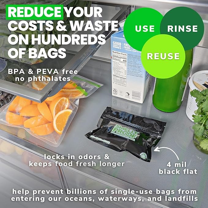 50pk 4-MIL Thick Heavy Duty, Smelly Proof Reusable Bags Black, Reusable Food Storage Bags, US-Made Non-Silicone, BPA Free, No PEVA, 50 x Reusable Snack Bags, NO SMELL Freezer Bags Triple Zip 12" x 16"
