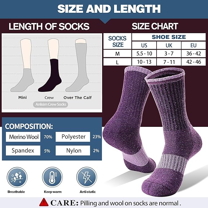 - Composition:Anlisim womens hiking socks are made of 70% Merino Wool, 23% Polyester, 5% Spandex , 2% Nylon,which are wearable and durable.And you can wear them in all season.