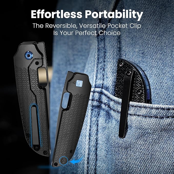 - 【Hidden Reversible 3D Pocket Clip】There is a Titanium piece filiing the hole of the clip of one side, so there is no hole affecting the look of this pocket knife. If you want to change the side of the clip, you just need to loosen the clip screw, take out the clip and then the Titanium piece, install the Titanium piece to another side, and install the clip.