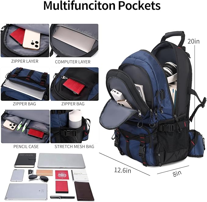 - Large Capacity: With 40L storage space, this backpack features with multi-compartment design includes one main zipped compartment, several front pockets with zippers and two side pockets. Large capacity helps you easily organize all your essential items.
