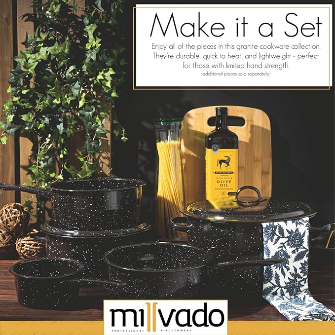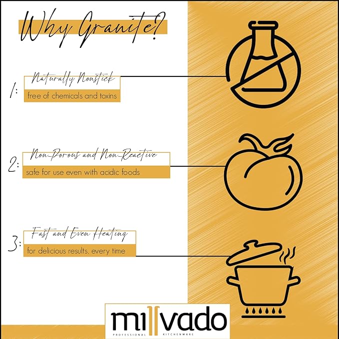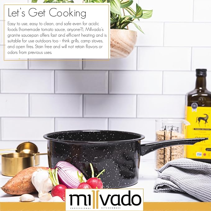 - NATURALLY NONSTICK: Our sauce pans are carefully crafted with a core of carbon steel, then covered on the inside and outside with a layer of natural enamel. With these speckled stoneware pots, you get the benefits of non stick cookware without having to worry about chemicals! Does not react to acidic foods, either.