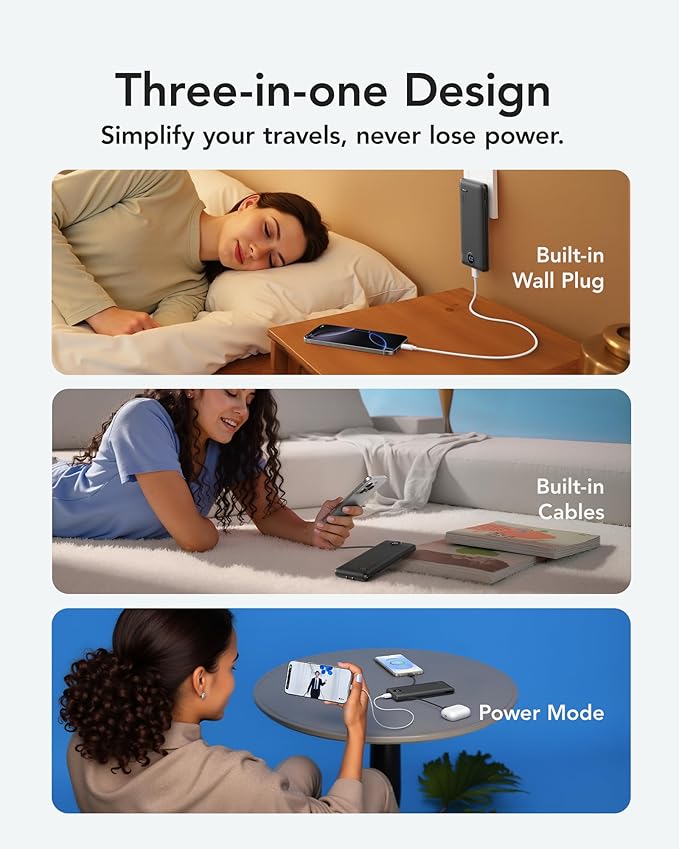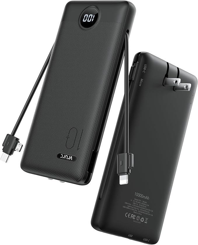 - [Portable Charger With Built-in AC Wall Plug] This portable charger not only features built-in Micro, USB-C, and for iPhone charging cables but also includes USB and USB-C ports for added versatility. Moreover, the portable phone charger incorporates a built-in wall plug, enabling direct charging of the power bank from a wall outlet.