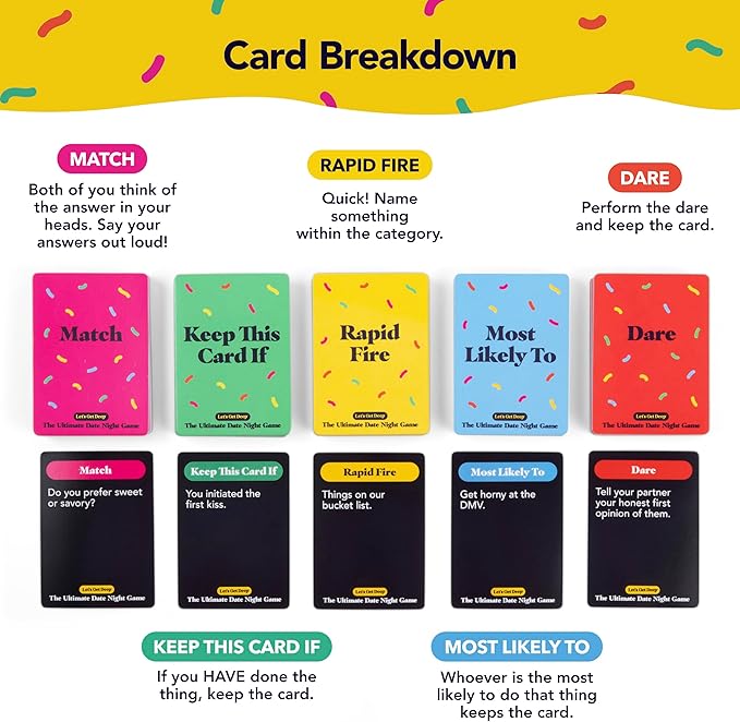 - What's Inside: This game includes 300 cards, divided into five categories, along with a spinner and instructions. Get ready to have fun together while building bonds of love, intimacy, and friendship.
