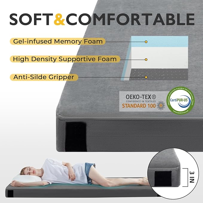 - COMFORT AND SUPPORTIVE FOAM: The camping mattress features a 2-Layer design that includes 1'' gel-infused memory foam and 2'' high-density support foam. The combination creates a medium-firm that balances comfort and support and keeps its shape even after long-term use.