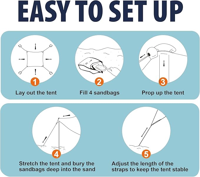 - 【 Effortless Sunshade Angle Control 】 - With the changing position of the sun, you can effortlessly adjust the angle of our beach tent to ensure maximum shade and comfort. No more struggling with heavy sandbags or labor-intensive digging - our innovative design makes adjusting the sunshade angle a breeze.