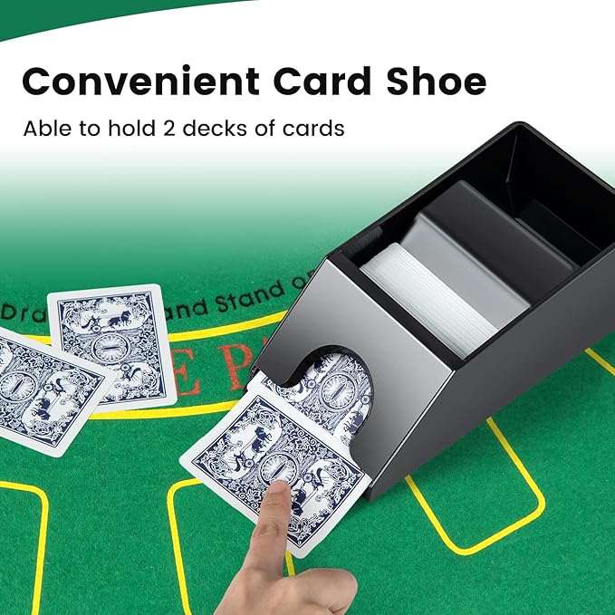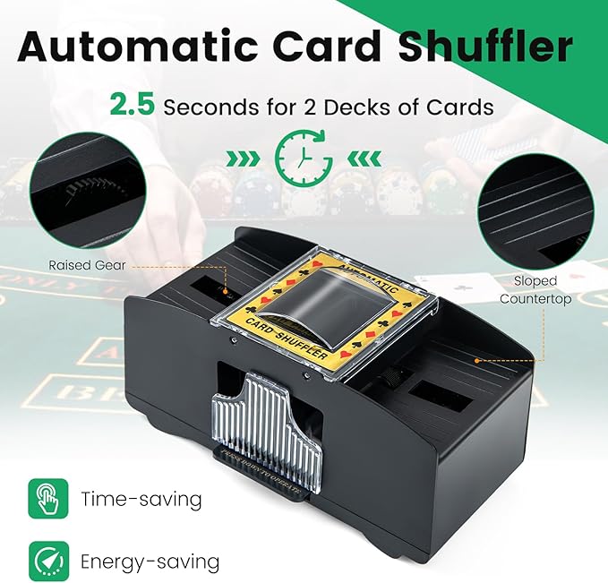 - đ˛ăCard Shuffler & Card Shoeă Our automatic card shuffler features a sloped countertop and raised gear for efficient shuffling. It will quickly shuffle 2 card decks for 2.5 seconds. Also, the convenient card shoe is able to hold 2 decks of cards.