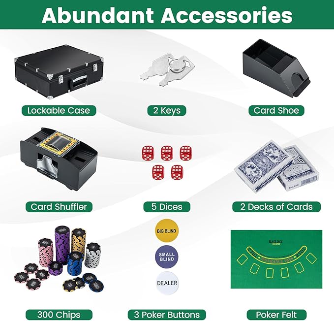 - đ˛ăComplete Poker Chip Setă You will get 1 table felt, 1 card shoes, 1 card shuffler, 2 decks of cards, 3 poker buttons, 5 dices and 300 chips from our lockable case with 2 keys. This poker set allows 4-10 people to enjoy the poker night.