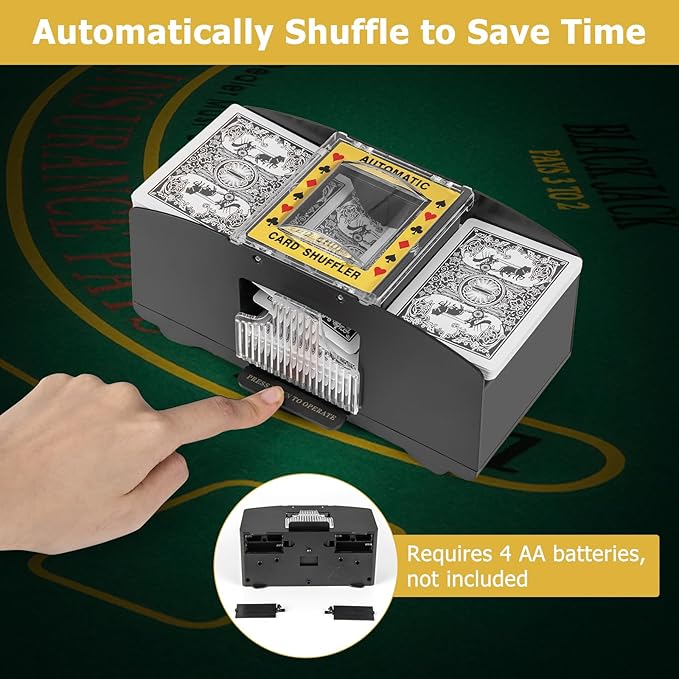 - 🎲【Automatic Card Shuffler】 Our card shuffler can automatically shuffle to save time. Thanks to raised gears, it can shuffle 2 decks of cards in 2.5 seconds, which frees your hands. Tips: It requires 4 AA batteries, not included.