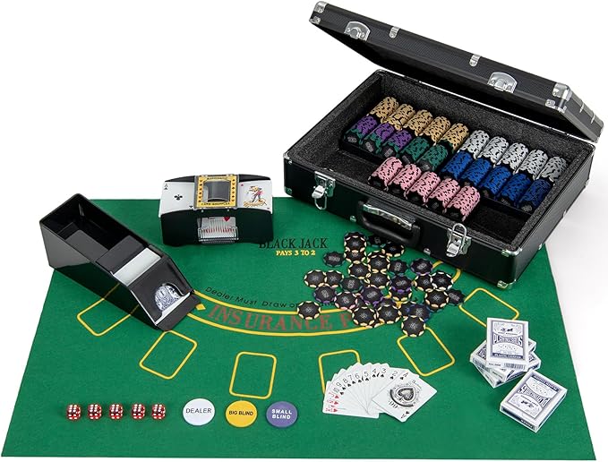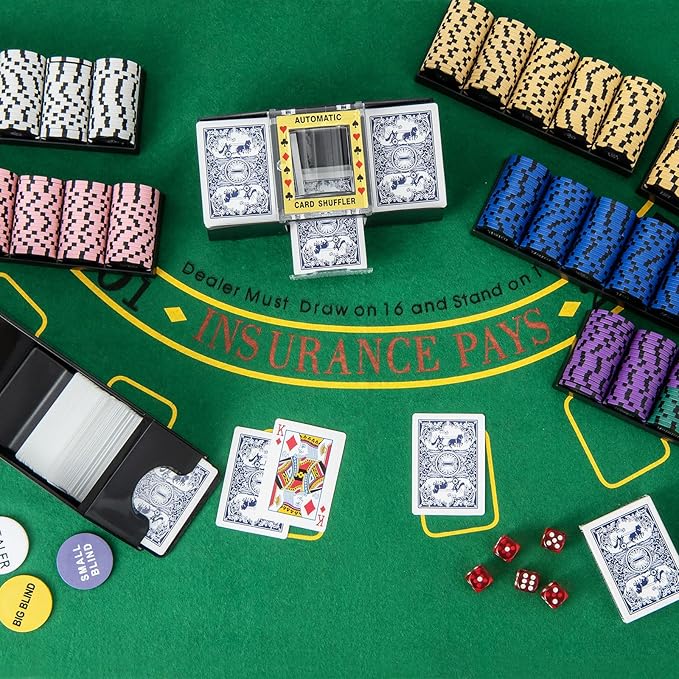 - 🎲【Bring You Everything】 600 pieces of chips, 6 card decks, 5 dices, 3 dealer buttons, 1 poker felt, 1 card shoe and 1 card shuffler are all included in our case. It will be a nice option for 4-10 persons to fully enjoy the game time.