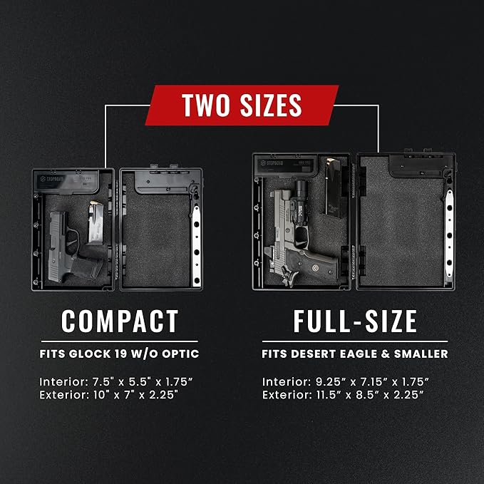 - đşđ¸ăFULL-SIZE VS. COMPACT SIZEăStopBox Pro Full-Size â Interior: 9.25â x 7.15â x 1.75â | Exterior: 11.5â x 8.5â x 2.25â for versatile storage. StopBox Pro Compact â Interior: 7.5â x 5.5â x 1.75â | Exterior: 10â x 7â x 2.25â for compact handguns. Built-in compartment (5â x 1.5â x 1â) for small valuables or accessories.