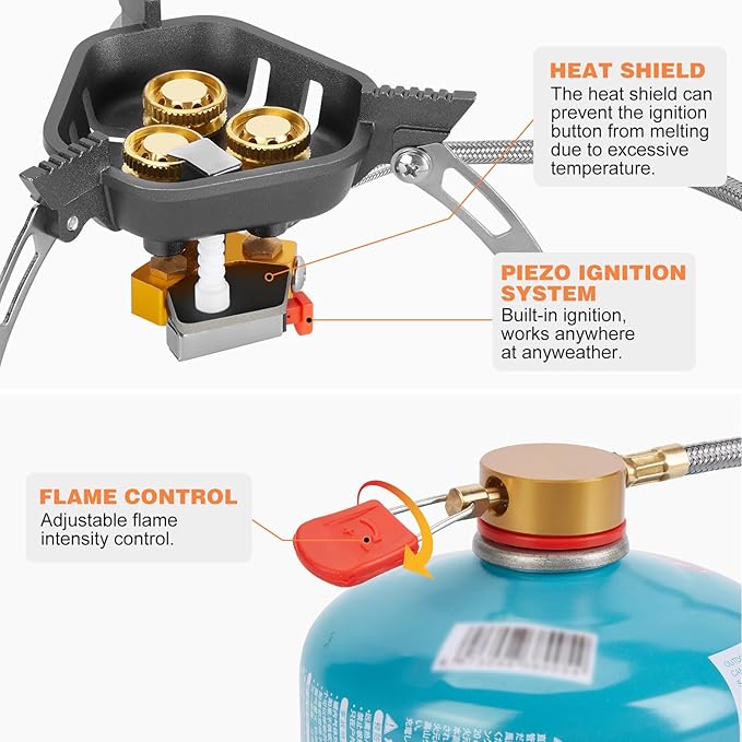 - Upgraded Design: The camping stove is consisted of three brass burner, with high power 7200W, heats faster and it takes less than 2 minutes to boil 1L water. The wider cooking area can support more types of cooking utensils. After adding the baffle, it is easier to ignite. The backpacking stove's flame control knod has a long handle, it is more convenient to adjust the flame size. In addition, the bottom of the support arms with silicone non-slip pads to prevent the camping stove from sliding.
