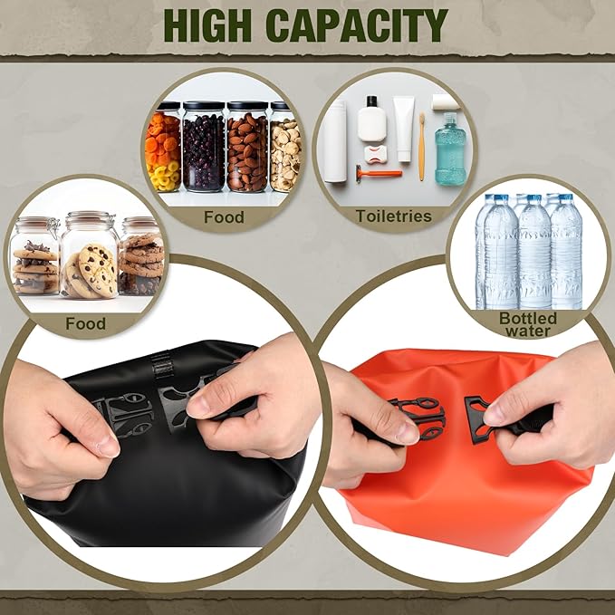 - Bear Food Bag Hanging System: includes 2 bear food bags respectively in black and orange, 4 sturdy nylon ropes in 2 colors, namely black and army green, 4 clips in black, and 2 rock pouches in black; The package ensures you have everything you need for a convenient and efficient setup