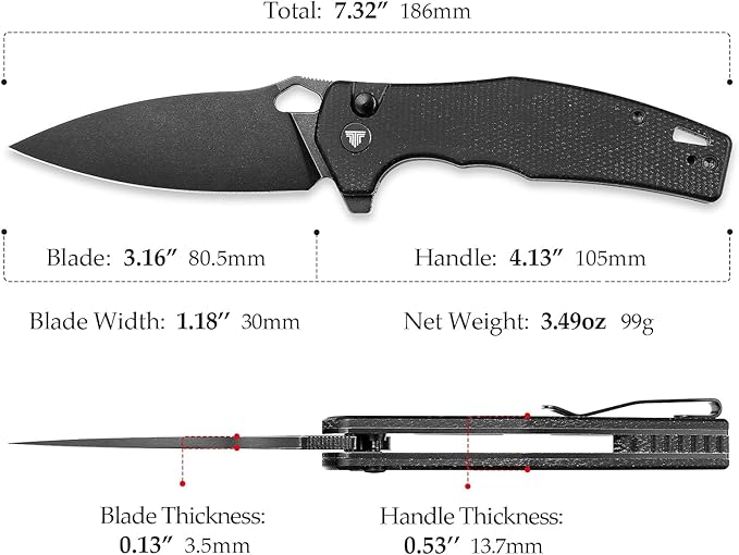- Parameters: Overall length:7.32"(186mm), Blade length:3.16"(80.5mm), Closed length: 4.13"(105mm), Blade thickness0.13"(3.5mm), Shank thickness: 0.53"(13.7mm), Hardness: 58-60HRC, Weight: 3.49oz(99g), Blade Material:Sandvik 14C28N Steel, Designer: Hydra.