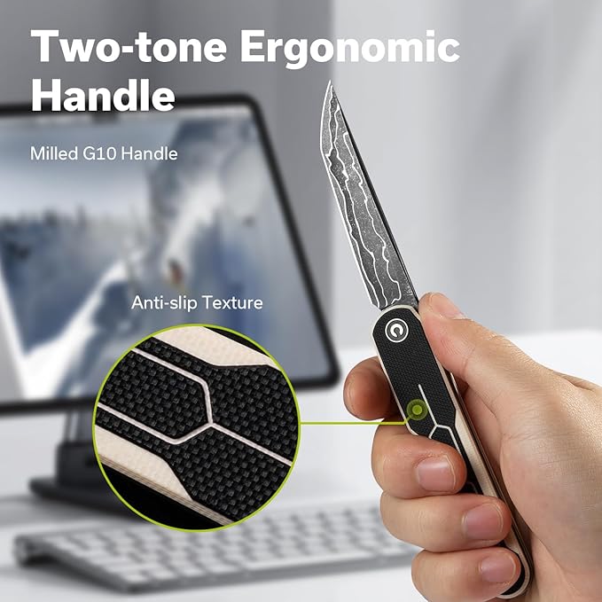 - Two-tone Ergonomic Handle --- The anti-slip, EDC handle of the folding knife is made of two-tone G10 material through superb production technology, which is both beautiful and durable.