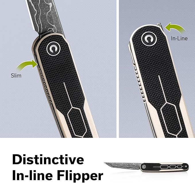 - Distinctive In-line Flipper --- The In-line Flipper lines up perfectly with the handle without taking up any extra room, while enhancing the aesthetic appeal. When the pocket knife is opened, it locks in place with the liner lock.