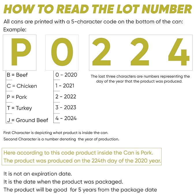 - NOTE:- This Item does not have expiration dates on the product but cans are printed with a 5-character code on the bottom of the can in order to identify the product inside the can and to identify the date of production. If there are any concerns about shelf life or expiration please do not hesitate to reach out.