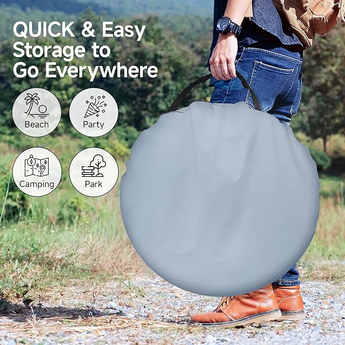 - Effortless Setup & Compact Storage: Benefit from our innovative pop-up design with automatic fiberglass ribs that make setup a breeze. The tent folds down easily, fitting into a compact carry bag (47.2" diameter, 2" height), making it perfect for travel, camping, and easy storage. However, for optimal safety and performance, avoid using in wind conditions exceeding 24-30.8 miles/hour.