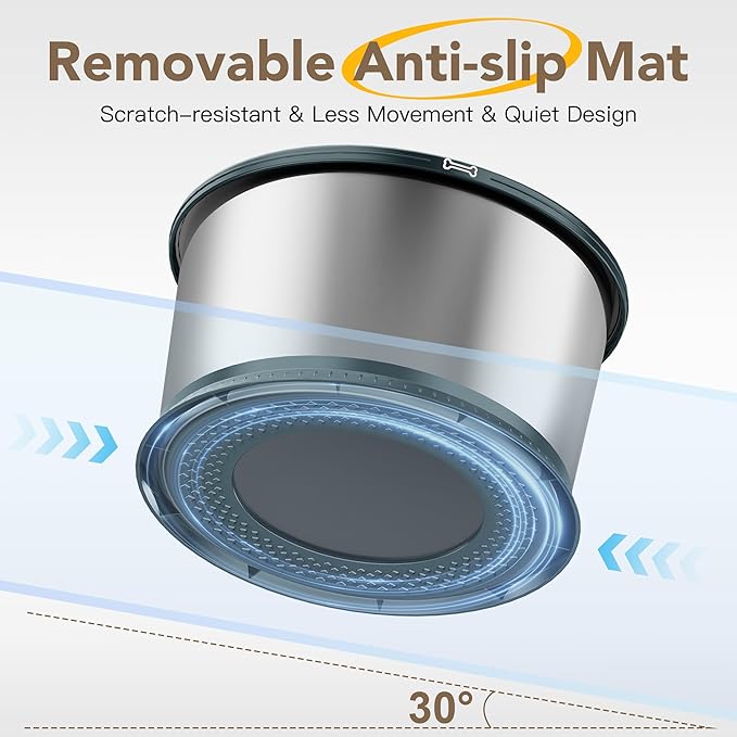 - Anti-slip and Spill-proof Design: Pet slow drinking water bowl has wider fixing border and silicone anti-slip mat, together with the floating disk can effectively prevent splashing and stop wetting the floor, the silicone anti-slip mat on the bottom of the dog water bowl can keep the bowl fixed in place and won't scratch your floor, also prevent your dog from slipping and pushing the bowl when drinking. Note: The anti-slip mat is designed separately to facilitate daily cleaning