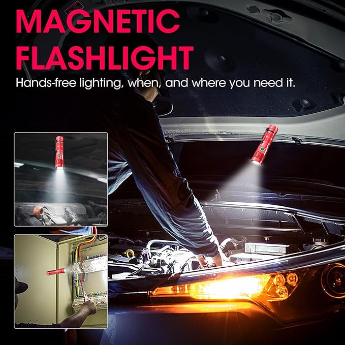 - LED Magnetic Flashlight--- Our magnetic flashlight is compact and portable, with a powerful magnet in the tail cap, allowing for easy attachment to any metal surface. Whether you're working on a construction site, exploring the great outdoors, or need a convenient light source while camping, this flashlight is the perfect tool for the job.
