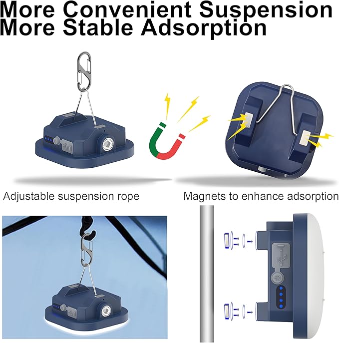 - 【Convenient to use】This portable camping light comes with one detachable strap hooks,carabiner and magnet, at the base that can hang the tent light upside down to get better light when lighting up a big area.The Improvement magnet could adsorbed on any surface of metal.