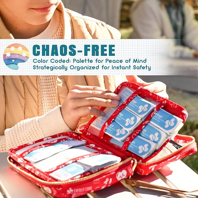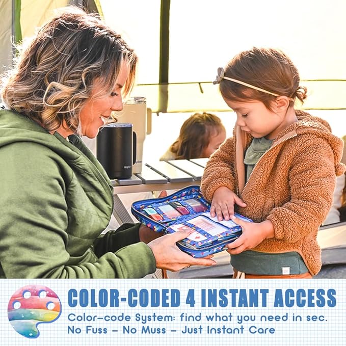 - 🌈 Travel-Friendly Organization: Our first aid kit is meticulously designed to ensure quick access during travel emergencies. Our supplies are neatly organized in designated compartments, all in one compact and portable storage bag, allowing for quick grabs during emergencies, making it perfect for parents on the go!