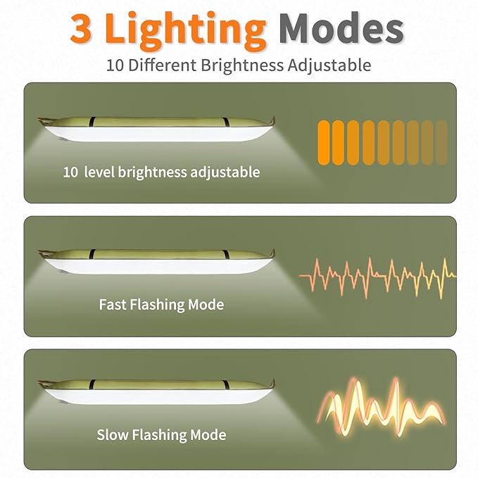 - Versatile Hanging & Magnetic Mounting-Features a built-in hook for hanging in tents or trees, plus magnetic tabs to attach to metal surfaces (vehicles, RVs, toolsheds). Adjust between 4 lighting modes (3 brightness levels + flashing) for any scenario!