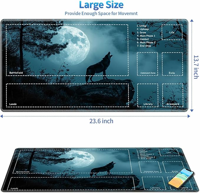 Playmat for MTG with Zones, 24 x 14 inches Game Play Mat for MTG TCG, Trading Card Game Play Mat Desk Mats with Stitched Edges Non-Slip Base, Wolf Howling