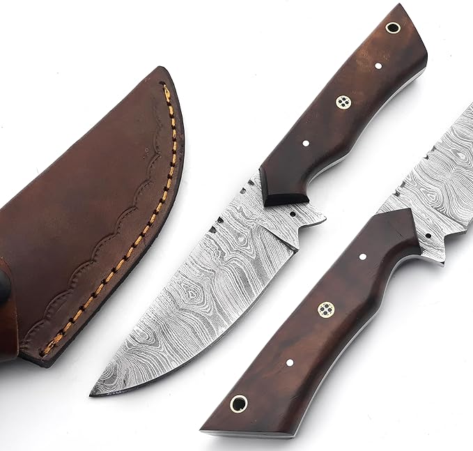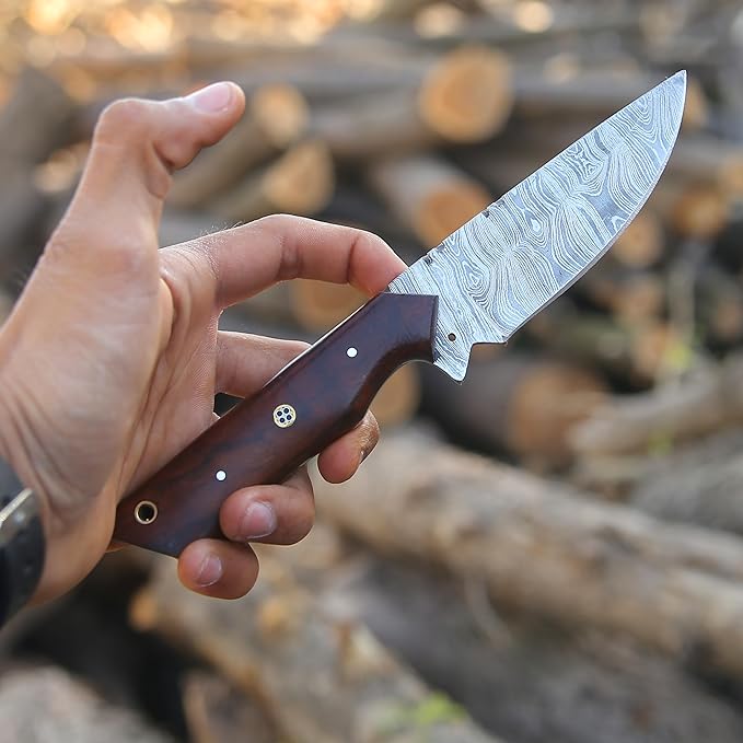 - [Handmade Damascus Crafted Knife] Its hand forged and crafted excellent. It’s a multiple purpose carry knife with a rosewood handle, Damascus sharp edge blade and leather sheath with perfect quality.