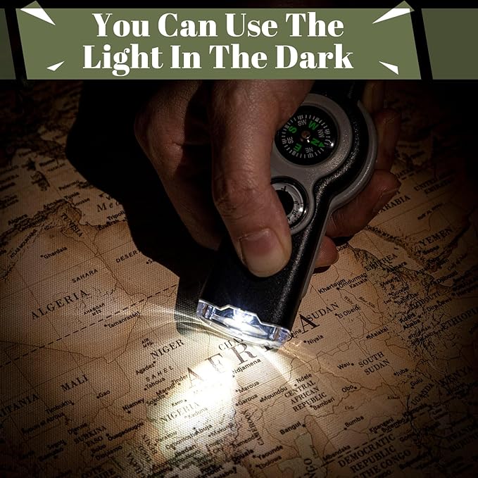 - Multifunctional Design: this camping whistle is thoughtfully designed with 7 integrated features, a whistle, a compass, a thermometer, a magnifying glass, a reflector, a storage bin and LED light; All these components can be quickly disassembled and assembled, suitable for providing essential information during outdoor activities; With all these features intertwined, every adventure becomes safer and more enjoyable