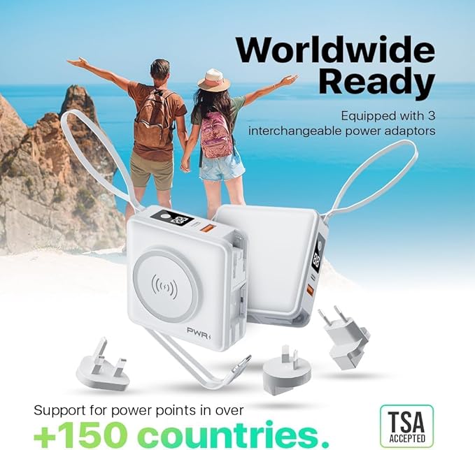 PWR Travel PRO 5-in-1 Power Bank with Case Included ??10,000mAh with Built-in Cables ??20W USB-C + 15W Wireless Charging ??Compact Portable Charger for iPhone & Android - White