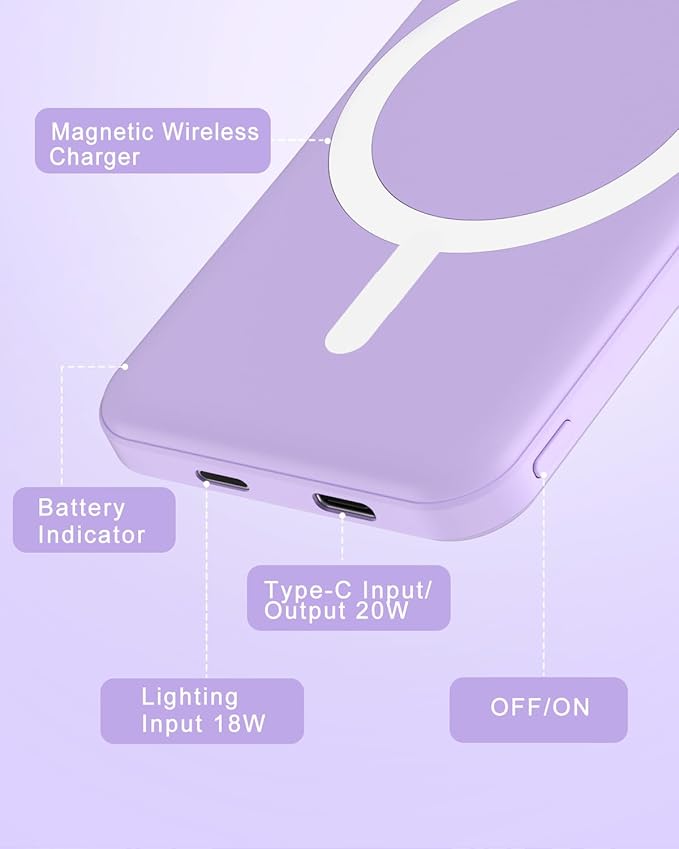 podoru for Magsafe Battery Pack, 5000mAh Magnetic Power Bank with Type-C Cable 20W PD Fast Charging Lighting Input Wireless Portable Charger for iPhone iPhone 17/16/15/14/13/12/ All Series-Purple